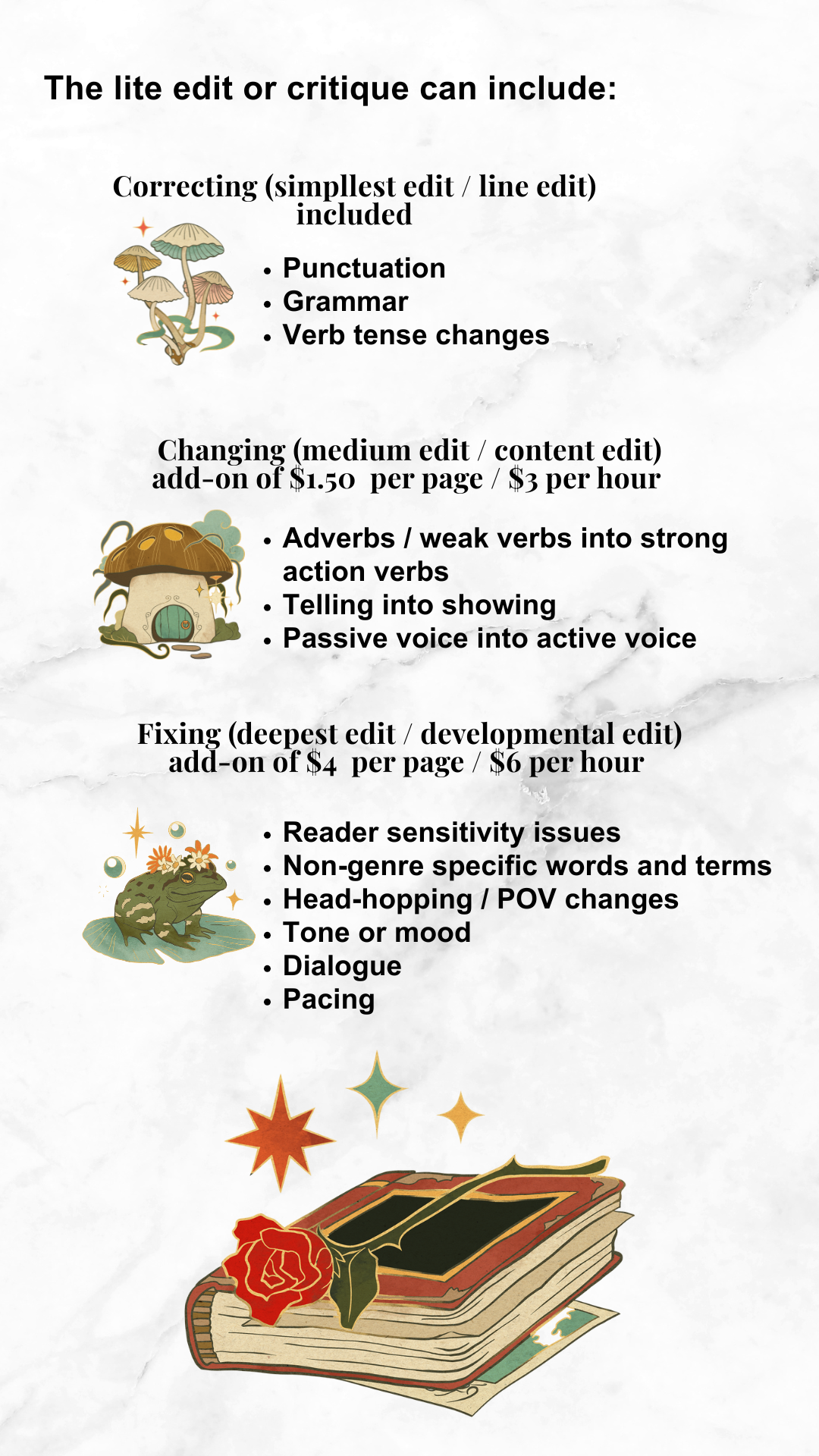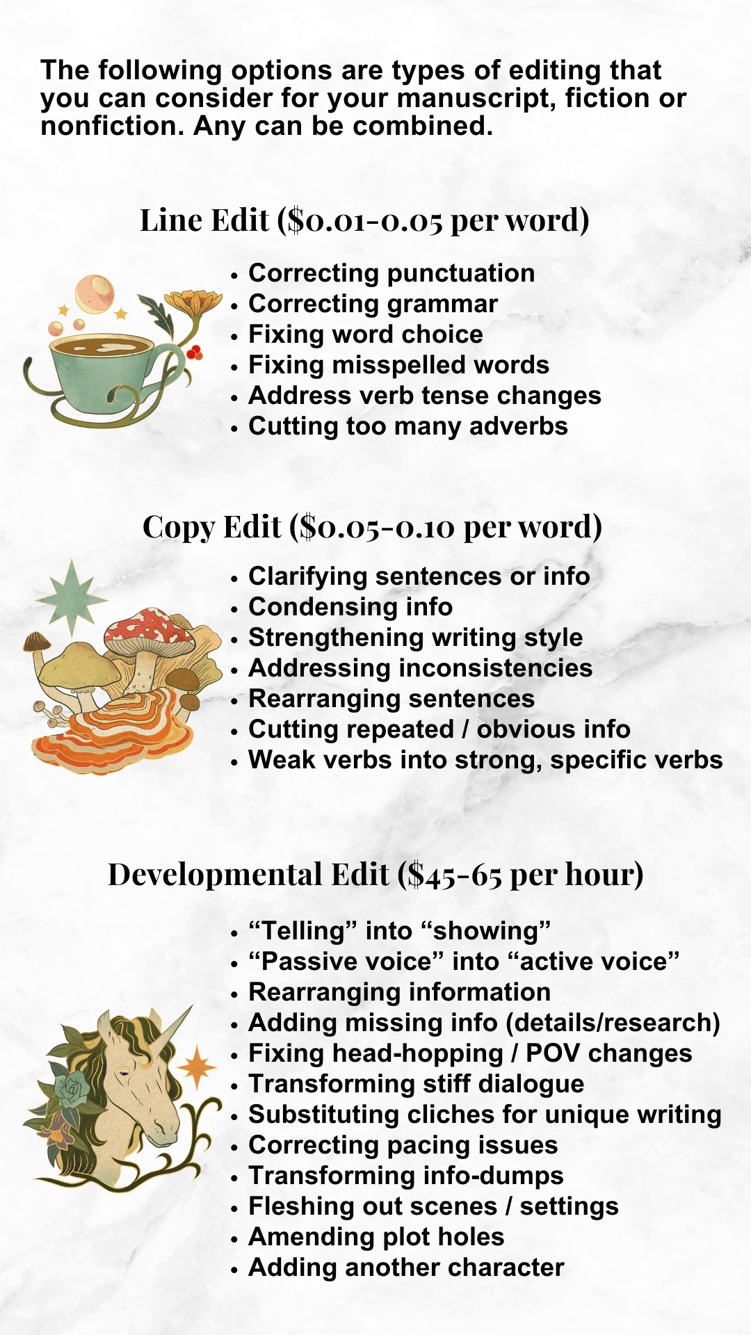 *Rates are calculated based off of word count / page count and are influcenced by genre, combinations of any of the following editing needs, and time constraints.