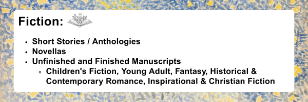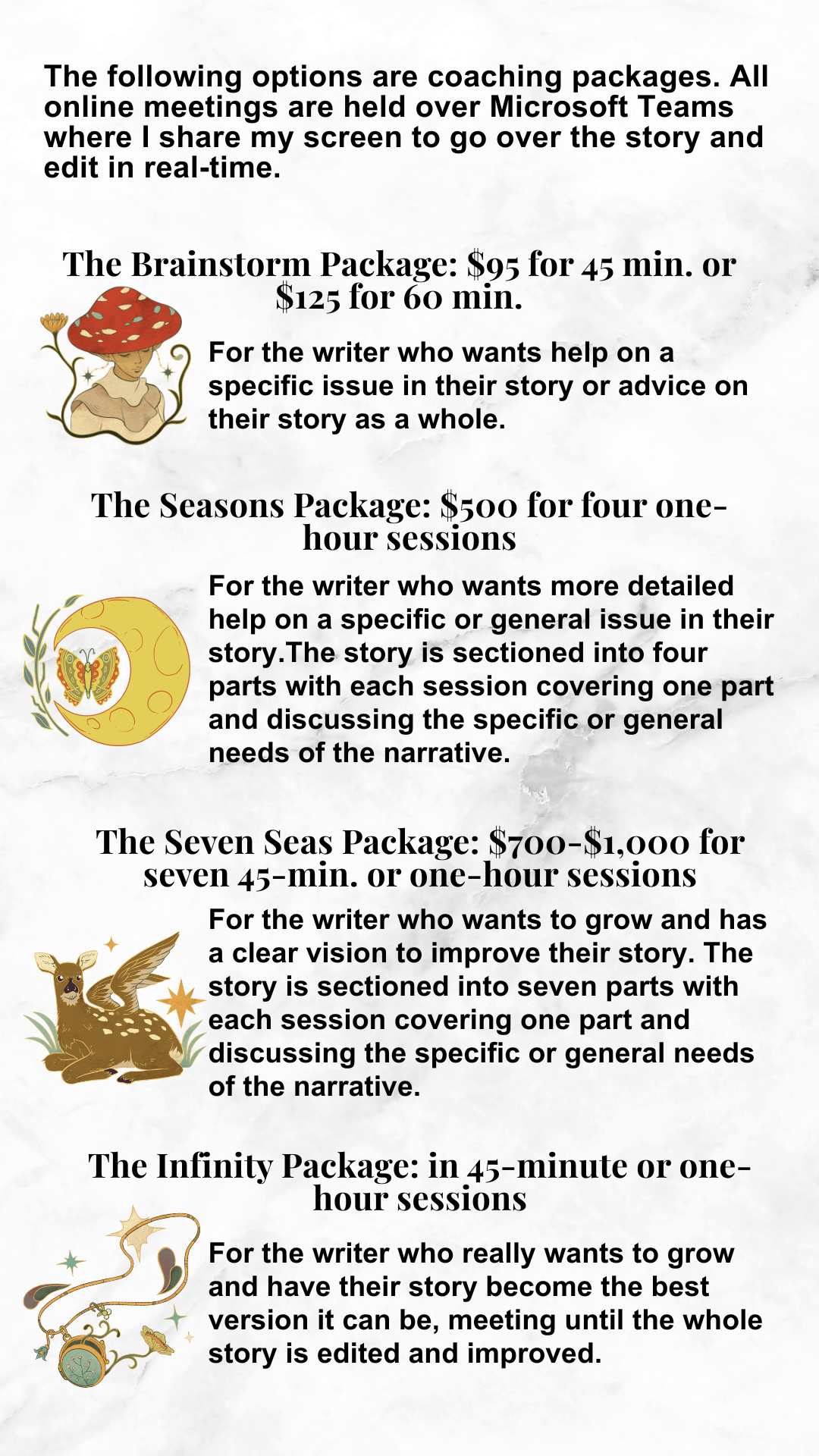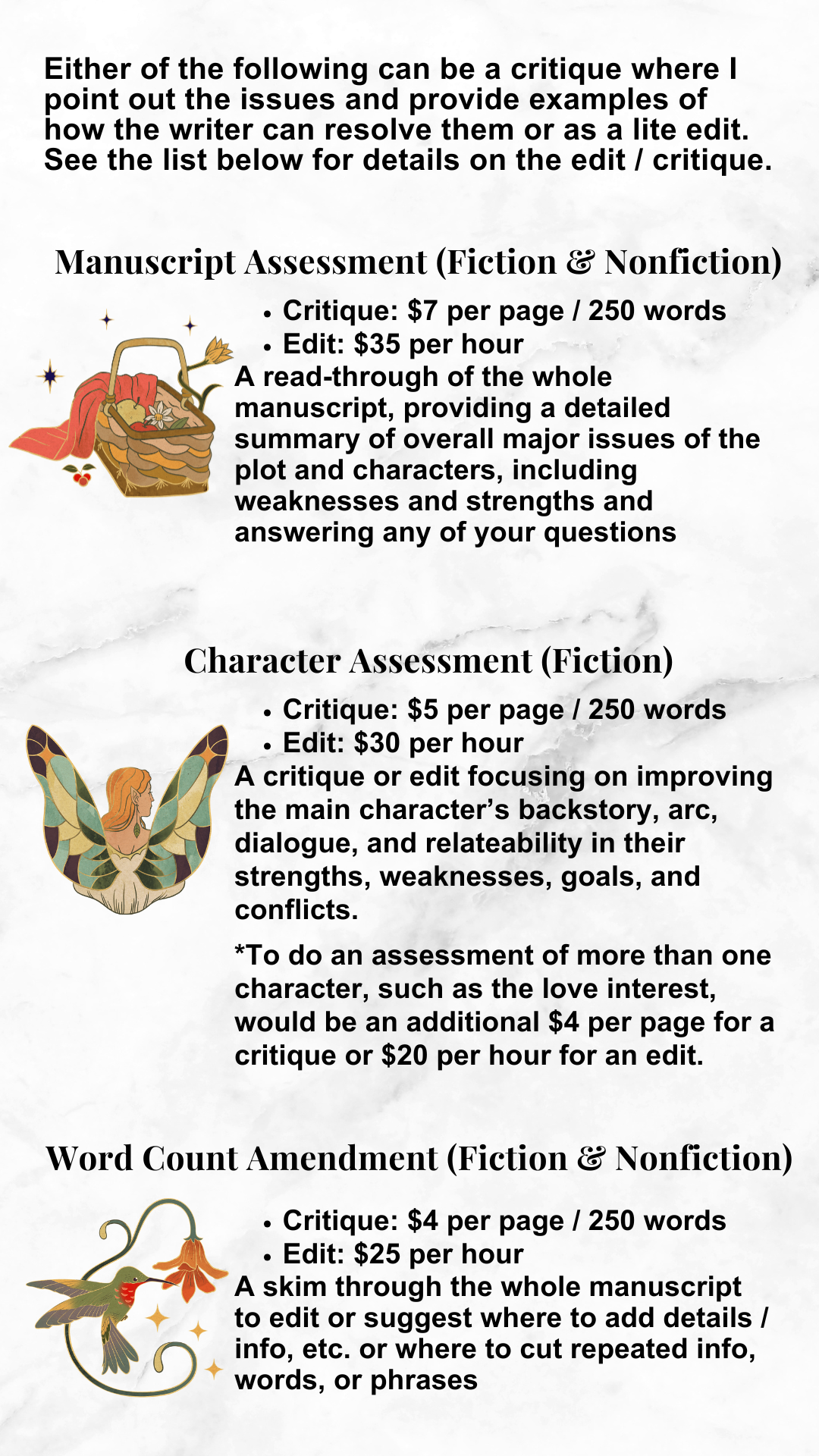 *Rates are calculated by two main componants: (1) to do a critque or editing and (2) on word count / page count and are influenced by genre, combinations of any of the following in the list, and time constraints.